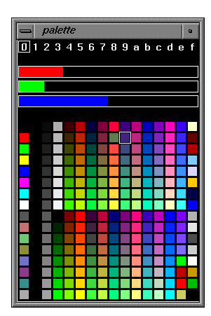 Palette is an interactive utility for manipulating colormaps, and savemap and loadmap are independent programs for saving and loading colormaps to/from a file. The colormap space of the SGI machine with full color has 4096 entries (see the online manual pages, e.g., man makemap). Palette, savemap, and loadmap treat it as 16 "sub-maps", each with 256 colors. These utilities are useful in conjunction with programs that operate in color space, but do not set up the colormap themselves (e.g., cpfg).