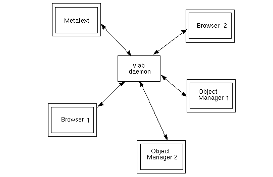 Vlab processes communicate with the vlab daemon using messages that are sent via UNIX sockets. When a process starts up and makes a connection with the vlab daemon, it must send a registration message to the daemon specifying the message types it wants to receive. These types of messages will then be posted by the vlab daemon to the process. The only exception is the message type that invokes an object; this message is not posted, because the vlab daemon itself invokes the object.Figure 1 - Sample connections to the vlab daemon