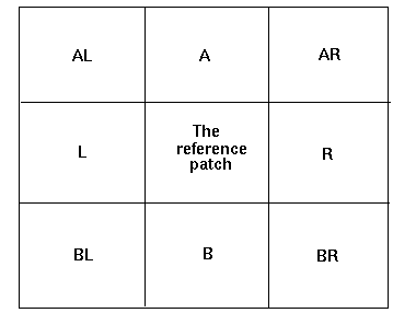 Once an arbitrary orientation has been chosen for the surface, adjoining patches can be considered to be above and to the left, AL, above, A, above and to the right, AR, to the left, L, to the right, R, below and to the left, BL, below, B, or below and to the right, BR, of a given patch.