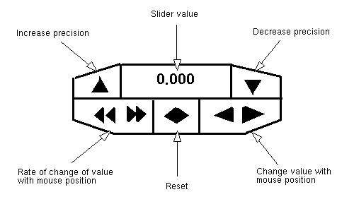 The horizontal arrows allow the user to change values and are activated using the left mouse button. The controlled value is shown in the top central part of the slider and changes down, if you move the cursor to the left and up, if you move it to the right. The up and down arrows make it possible to increase or decrease the precision of value manipulation and display. The central diamond shaped control is used to reset the slider value.Figure 2 - The control panel slider