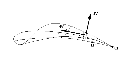 When integrating a surface into a plant model, the user must be able to control its position and orientation. This is accomplished by providing geometric parameters to be matched to the position and orientation specified in the plant model for the surface. The contact and end points are specified by points labelled CP and EP. The surface orientation is specified by a heading and an up vector, shown on the screen as arrowheads labelled HV and UV, respectively. These attributes are only displayed when the user selects the Geometry option from the ise popup menu, or selects the appropriate buttons from the Point selection array for manipulation. They can be manipulated in the same manner that control points are.